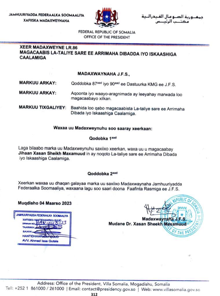The appointment was published in the Official Gazette posted in the Auditor General’s website. President Mohamud has yet to commit himself to the public office ethos of never giving family members, siblings, in-laws, and close relatives an unfair advantage over other citizens. He allows conflict of interest to erode governance. Why should President Mohamud’s daughter have access to the Somalia Foreign Ministry files in her capacity as a Senior Foreign Adviser to the President of Somalia?
