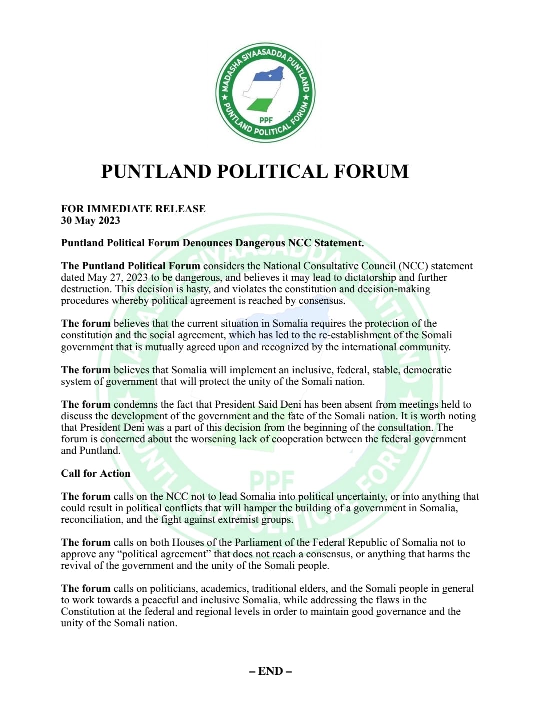 “The Puntland Political Forum considers the National Consultative Council (NCC) statement dated May 27, 2023 to be dangerous, and believes it may lead to dictatorship and further destruction. This decision is hasty, and violates the constitution and decision-making procedures whereby political agreement is reached by consensus” reads the statement.