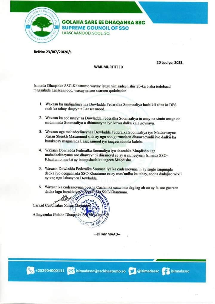 SSC-Khaatumo ayaa sidoo kale dowladda Federaalka Soomaaliya ka codsaday in ay sugto xuquuqda shacabka SSC islamarkaana soo de dejiso wixii ay xaq ugu lahaayeen dowladda.