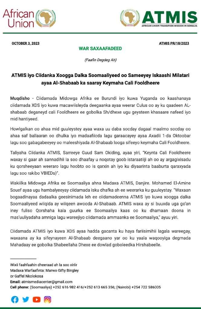 Howlgalka Midowga Afrika ee Soomaaliya (ATMIS) ayaa shaaciyay in hawlgal wadajir ah maleeshiyaadka AS looga saaray kaymaha Cali Fooldheere ee gobolka Shabeellaha Dhexe, islamarkaana khasaare xooggan lagu gaarsiiyay.