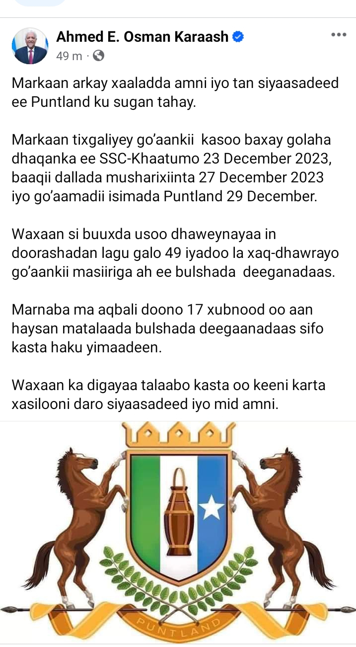 Qoraal ka soo baxay xafiiska Madaxweyne ku xigeenka Puntland Axmed Karaash ayuu si buuxda ugu taageeray go’aankii masiiriga ahaa ee reer SSC-khaatumo ku sheegeen in ay ka baxeen Puntland.
