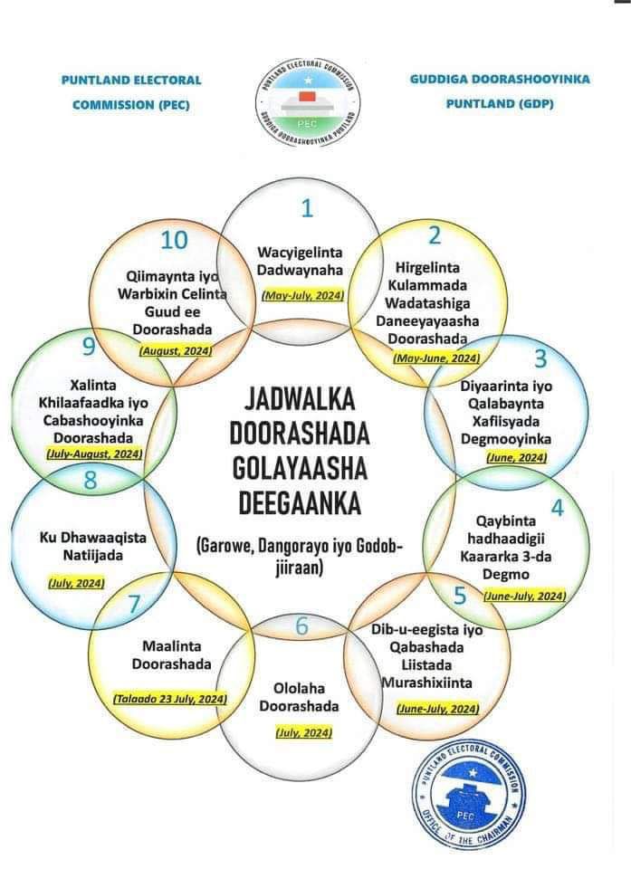 Garowe (PP News Desk) — One week after Puntland President Said Abdullahi Deni had discussions with political parties, the Puntland Electoral Commission (PEC) today published an electoral schedule for the local government elections to be conducted in three remaining districts.