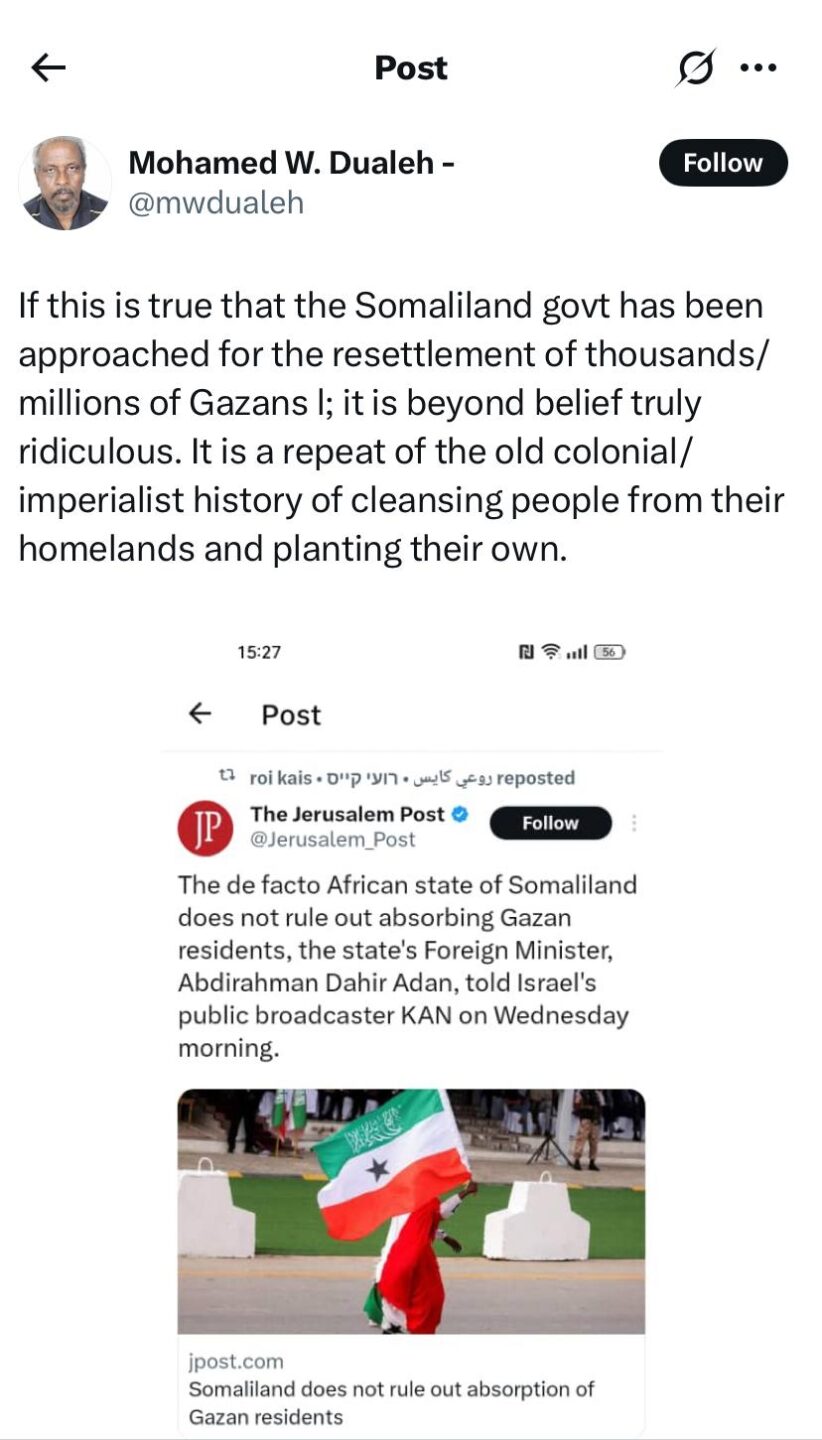 “If this is true that the Somaliland government has been approached for the resettlement of thousands/ millions of Gazans, is beyond belief, truly ridiculous. It is a repeat of the old colonial/ imperialist history of cleansing people from their homelands …” tweeted Mohamed W. Dualeh, former foreign adviser envoy of the former president of Somaliland administration. Last year, a major fundraising for Gazans took place in Hargeisa.