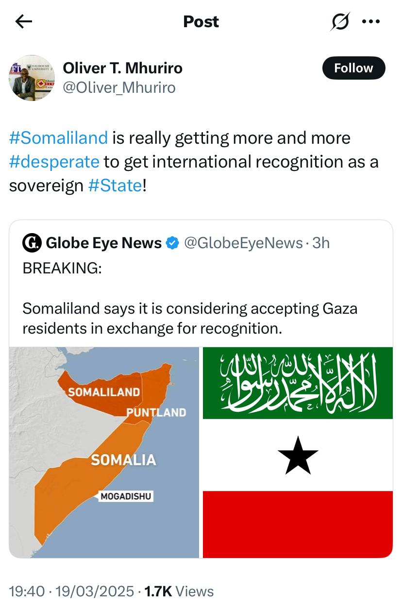 Somaliland administration claims to have unilaterally seceded from Somalia in 1991. Last week, the Foreign Minister of the Federal Republic of Somalia Ahmed Mo’alim Fiqi rejected the suggestion that Gazans could be resettled in parts of Somalia to implement the displacement plan proposed by the President of the United States, Donald Trump and the Israeli Government.