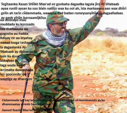 Dhinaca kale, tallaabadii ay qaadeen taageerayaasha General Sheegow Axmed Cali, Khamiistii, April 10, 2025, runtii waxay ahayd mid baal maarsan xeerarka dalka, iyo guud ahaan dhaqanka dowladnimmada, hasa ahaatee waxaa eedda dhacdadaas khatarta ku ahayd nolosha dad-weynaha iyo guud ahaan ammaanka magaallada Muqdisho qaadanaya oo mas’uuliyaddeeda dushiisa noqoneysaa nidaamka Xasan Shiikh Maxamuud, kaasoo aan looga baran inuu ku dhaqmo xeerarka iyo shuruucda dalka u taal, inuu run u sheego dad-weynaha, iyo innaba ha yaraatee inuu fuliyo ballan uu qaaday, waxaana mararka qaarkood loo qaadan karaa in Xasan Siikh Maxamuud ereyga siyaasad ugu macneysanyahay; inuu wax khayaano, inuu been sheego, iyo inuu ballan uu qaaday uu ka baxo! Waliba sifahaas ma aha mid ay adagtahay in laga dhex helo dhaqankiisa siyaasadeed ee maalinlaha ah!… marka dhacdadaas iyo kuwo la mid ah inay dhici karaan ma ahayn lama filaan, waana fikirka ay ku salaysantahay aragtida gaaban ee nidaamka siyaasadeed ee Loo Joojin Maayo!