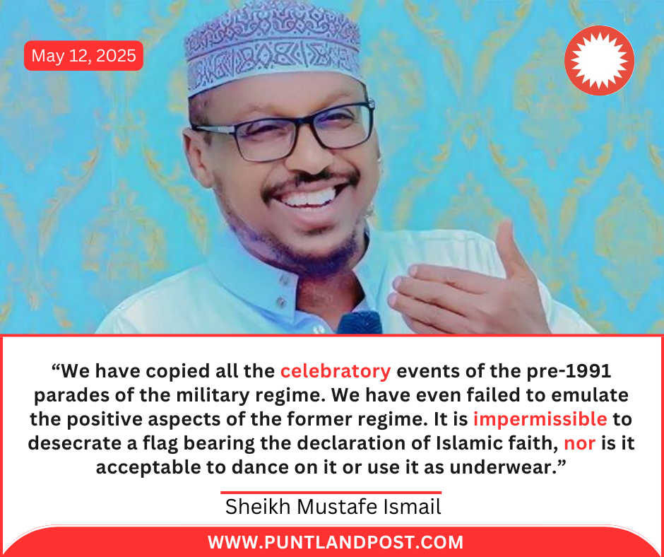 Sheikh Mustafe Ismail, a leading educator, criticised the practice of disrespecting the Shahada, the declaration of Islamic faith emblazoned on the Somaliland flag. “We have copied all the celebratory events of the pre-1991 parades of the military regime. We have even failed to emulate the positive aspects of the former regime. It is impermissible to desecrate a flag bearing the declaration of Islamic faith, nor is it acceptable to dance on it or use it as underwear,” Sheikh Mustafe said.