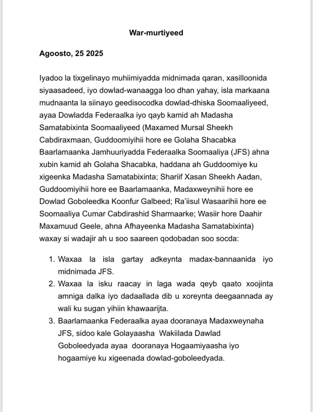 Warmurtiyeedkan waxa soo saaray Hoggaanka dowladda Soomaaliya iyo xubno ka baxay Madashii Mucaaridka, oo ay ku jiraan guddoomiye ku xigeenkii Madasha Maxamed Mursal Sheekh Cabdiraxmaan, Shariif Xasan Sheekh Aadan, Madaxweynihii hore ee Dowlad Goboleedka Koonfur Galbeed; Ra’iisul Wasaarihii hore ee Soomaaliya Cumar Cabdirashid Sharmaarke; Wasiir hore Daahir Maxamuud Geele, ahna Afhayeenkii Madasha Samatabixinta).
