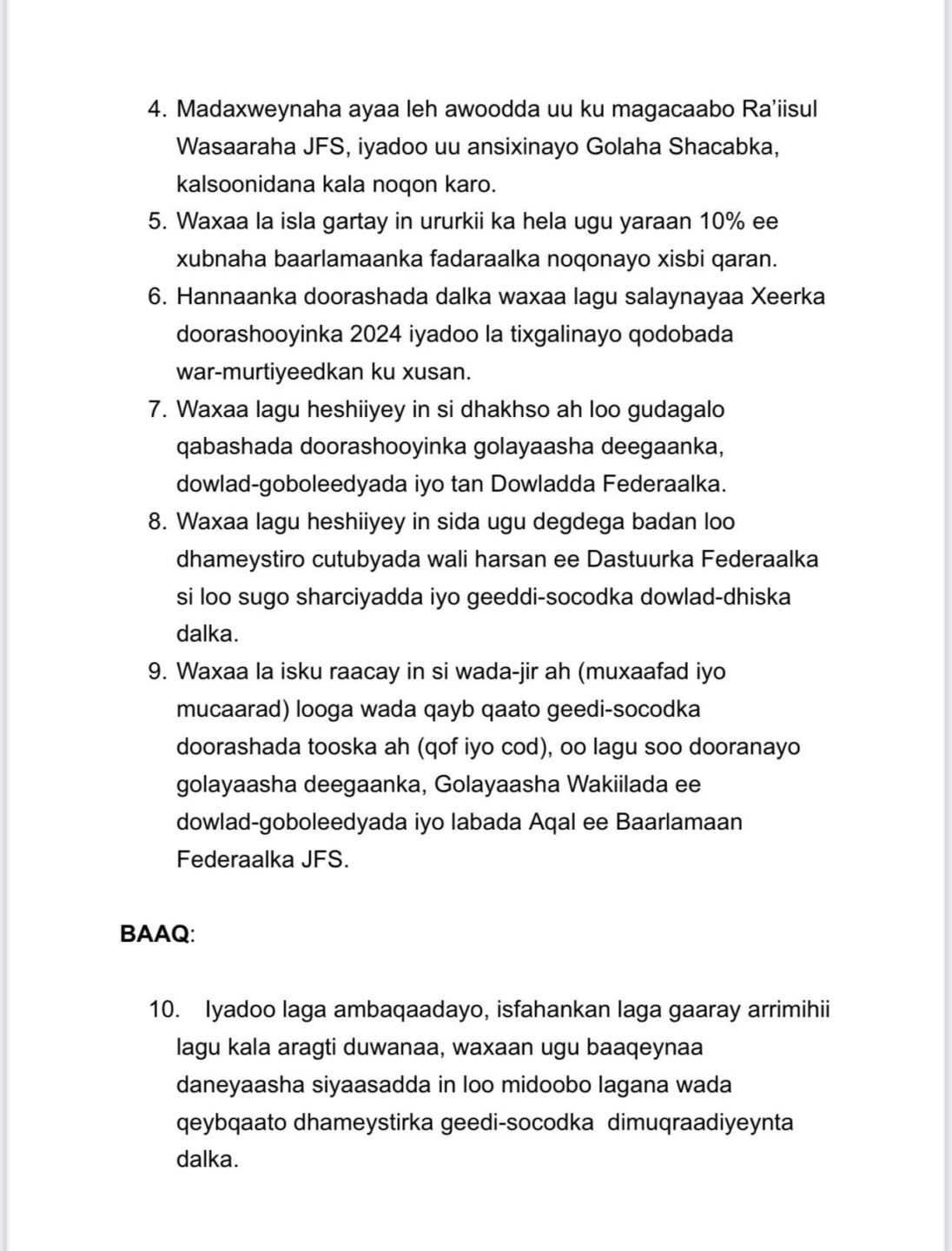 Sida Warmurtiyeedka ku cad waxay ku heshiiyeen in si dhakhso ah loo gudagalo qabashada doorashooyinka golayaasha degaanka, dowlad-goboleedyada iyo tan Dowladda Federaalka, islamarkaana sida ugu degdega badan loo dhameystiro cutubyada wali harsan ee Dastuurka Federaalka si loo sugo sharciyadda iyo geeddi-socodka dowlad-dhiska dalka.