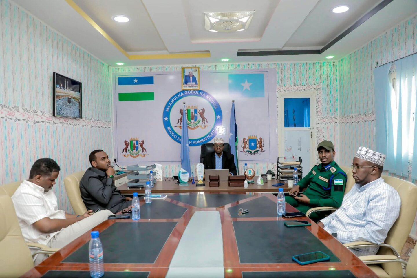 Guddoomiyaha Gobolka Mudug, Faysal Sheikh Cali Jifo-Jabsade, oo uu wehelinayo Guddoomiye Ku-xigeenka gobolka, Mudane Maxamed Xasan Xuseen Wallore, ayaa maantashir-guddoomiyay kulanka amniga gobolka Mudug.