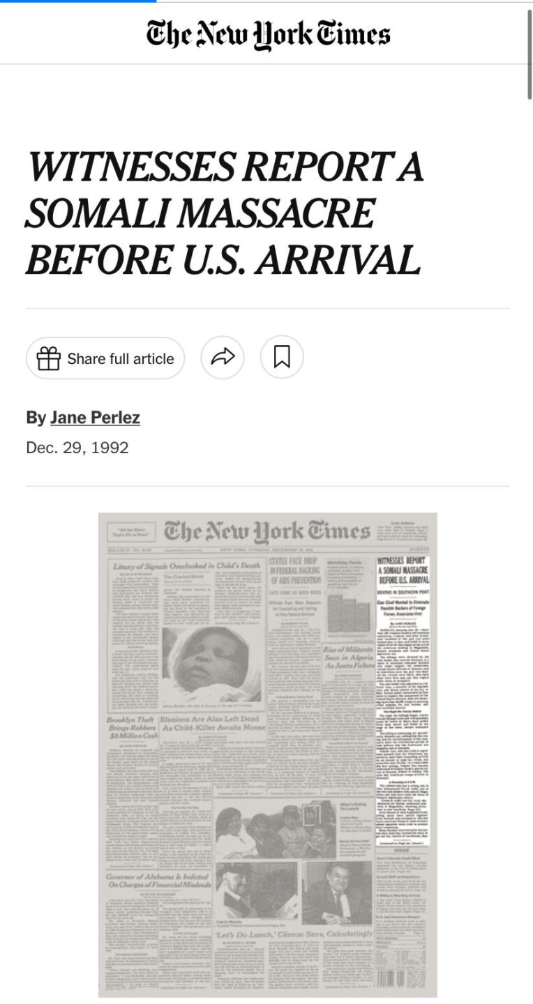 In December 1992, shortly before Operation Restore Hope began, Colonel Jess authorised the massacre of more than 100 Harti clansmen in Kismayo. The New York Times reported: “The killings were directed by the clan leader who controls Kismayu in a move to eliminate educated Somalis who might support the Americans, United States officials in Somalia said in interviews over the past two days. All the victims were Harti, who have deep roots here and say they regard other clans as occupiers
