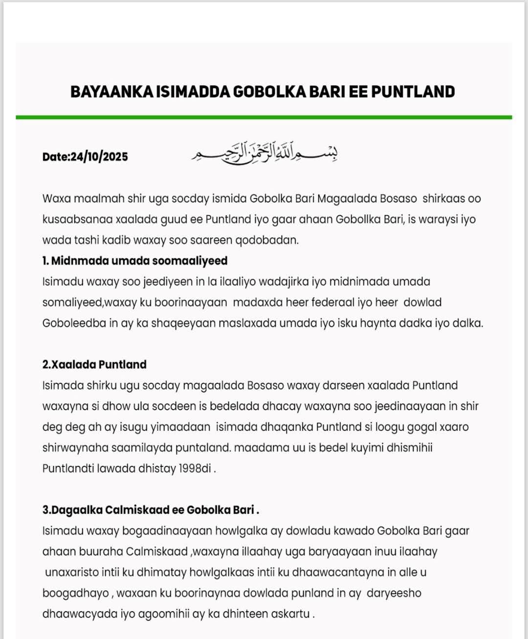 Qaar ka mid isimada gobolka Bari oo maalmihii la soo dhaafay shir uga socday magaalada Boosaaso ayaa soo saaray bayaan ka kooban dhowr qodob oo inta badan ay uga hadleen xaaladda Puntland.