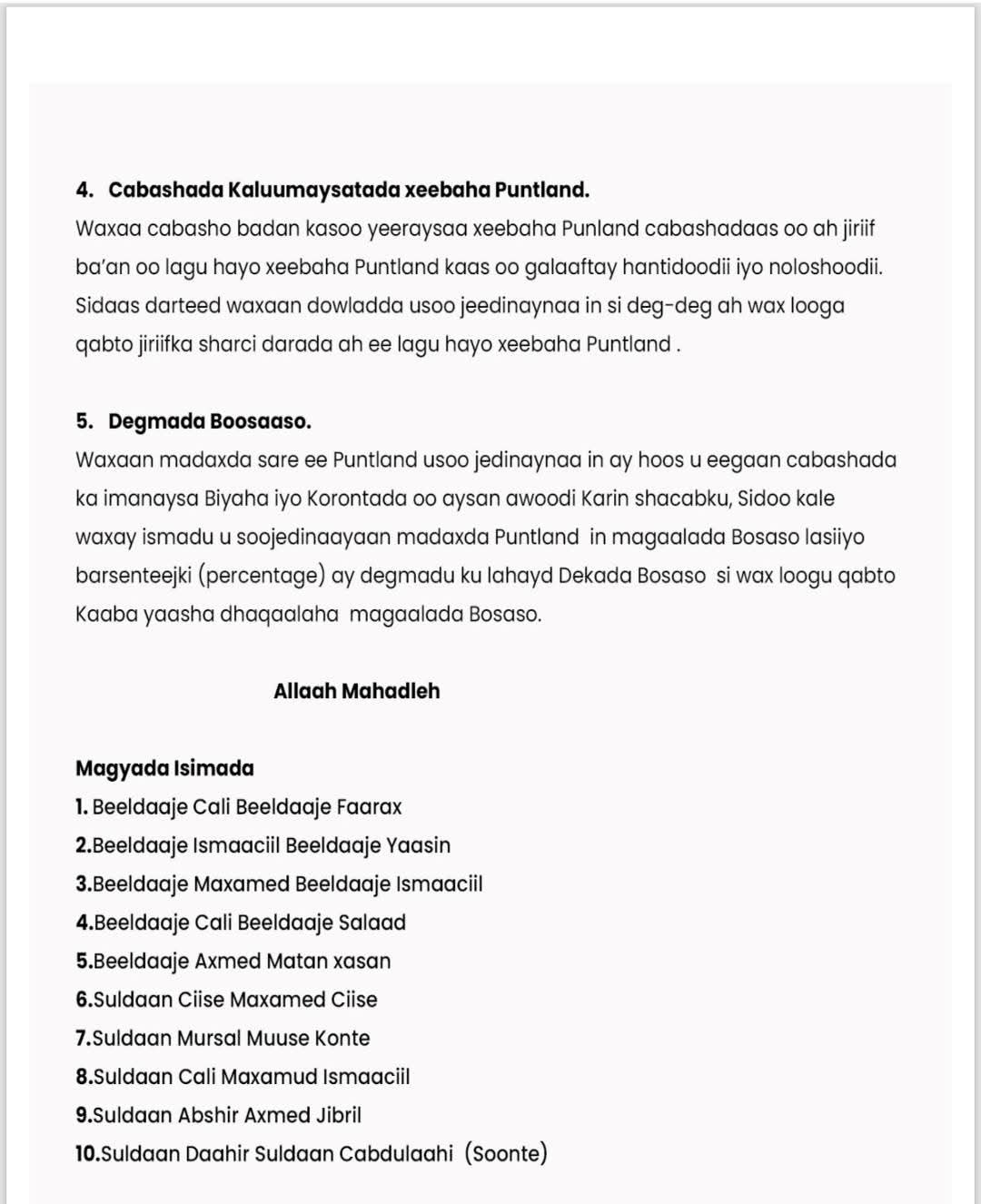 Sidoo kale waxay madaxda sare ee Puntland u soo jeediyeen in ay hoos u eegaa cabashada ka imanaysa shacabka Boosaaso ee la xiriirta qiimaha biyaha iyo korontada.