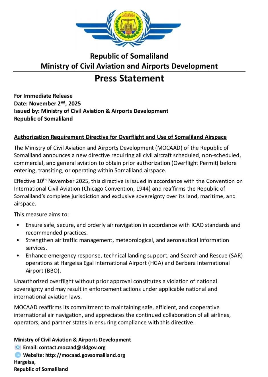 Warsaxaafadeed ka soo baxay baxay wasaaradda duulista iyo horumarinta madaarrada Somaliland ayaa lagu sheegay in duullimaad kasta oo soo gala hawadeeda oggolaansho la’aan ay ka qaadayso tallaabo.
