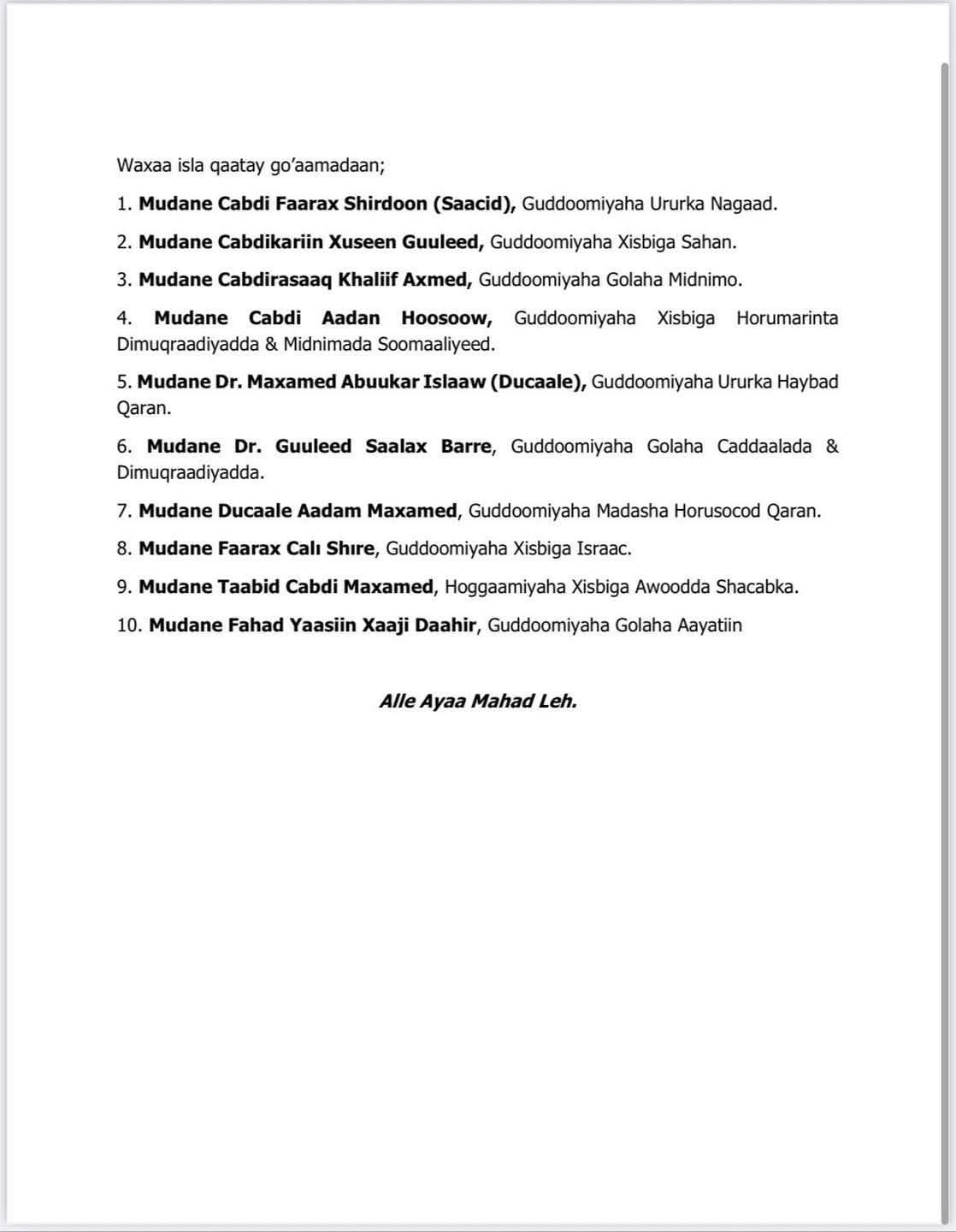 Toban siyaasi oo xilal kala duwan ka soo qabtay dowladda federaalka iyo dowlad goboleedyada ayaa ku midoobay in uu musharax madaxweyne u noqdo Ra’iisul Wasaare hore Cabdi Faarax Shirdoon (Saacid).
