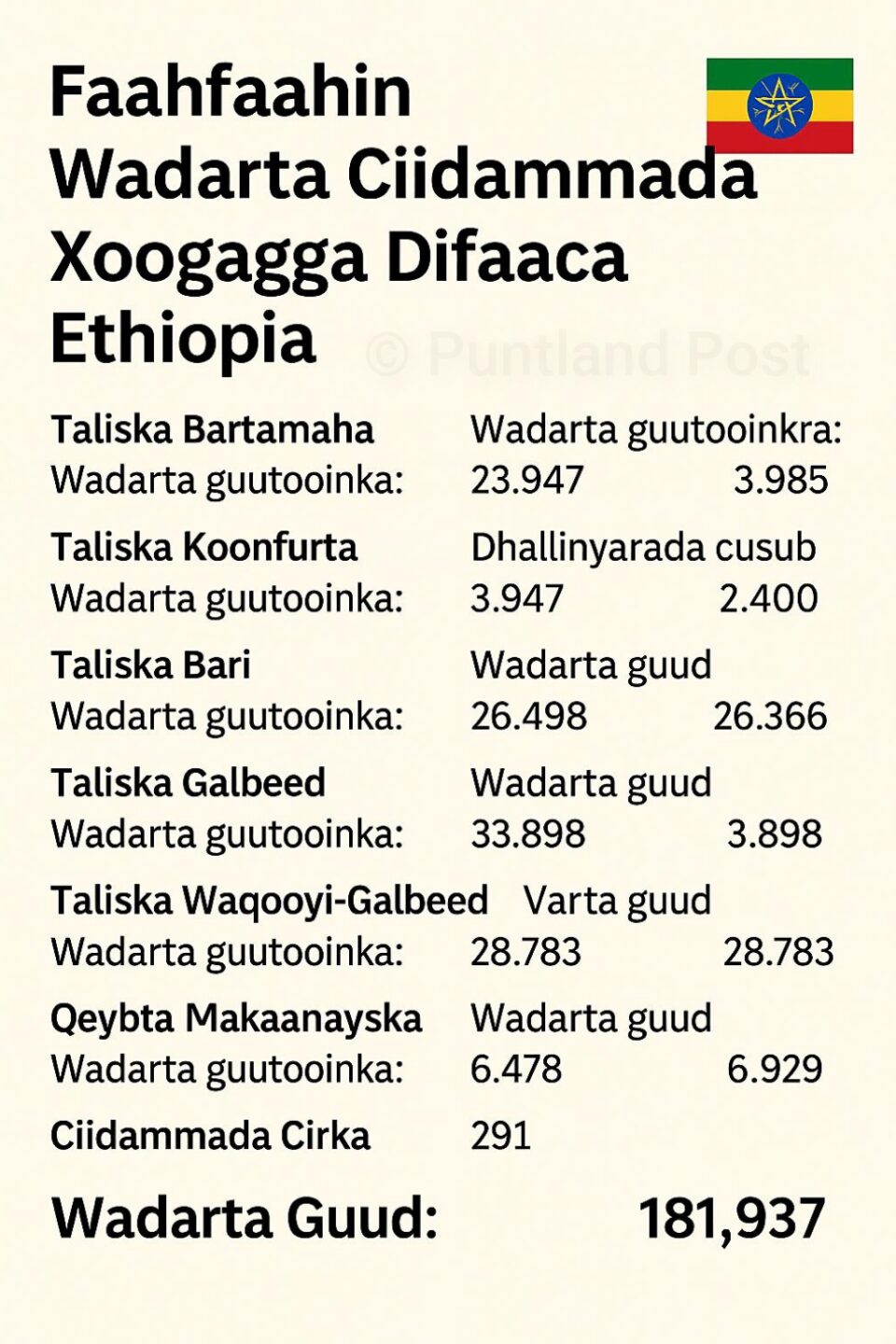 Addis Ababa (Wararka PP) —Xog lagu wadaagay mareegta Ethio-Forum ayaa muujinaysa tirada ciidammada xoogagga difaaca Itoobiya. Xogta, oo aan la xaqiijinin, waxaa lagu tilmaamay in laga soo xaday Wasaaradda Gaashaandhigga Itoobiya. Tirada talisyada iyo guutooyinka ayaa ku jirta xogta.
