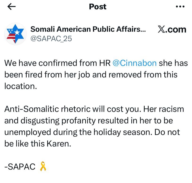 The Somali American Public Affairs Committee tweeted last week that Cinnabon, a bakery chain, had dismissed a worker who was racist towards a Somali customer. The customer had filmed the employee using inappropriate language in the shop she was managing. The former employee was immediately terminated by the franchise owner. “Their actions do not reflect our values or the welcoming experience every guest deserves,” Cinnabon tweeted.
