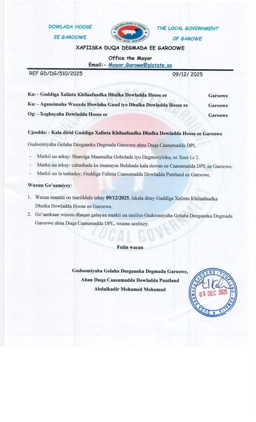 Guddoomiye Geedi ayaa warqad uu soo saaray ku sheegay in uu kala diray guddiga xallinta khilaafaadka dhulka dowladda hoose ee Garoowe, kaddib markii uu arkay cabasho ka imanaysa bulshada kala duwan ee caasimadda Puntland.