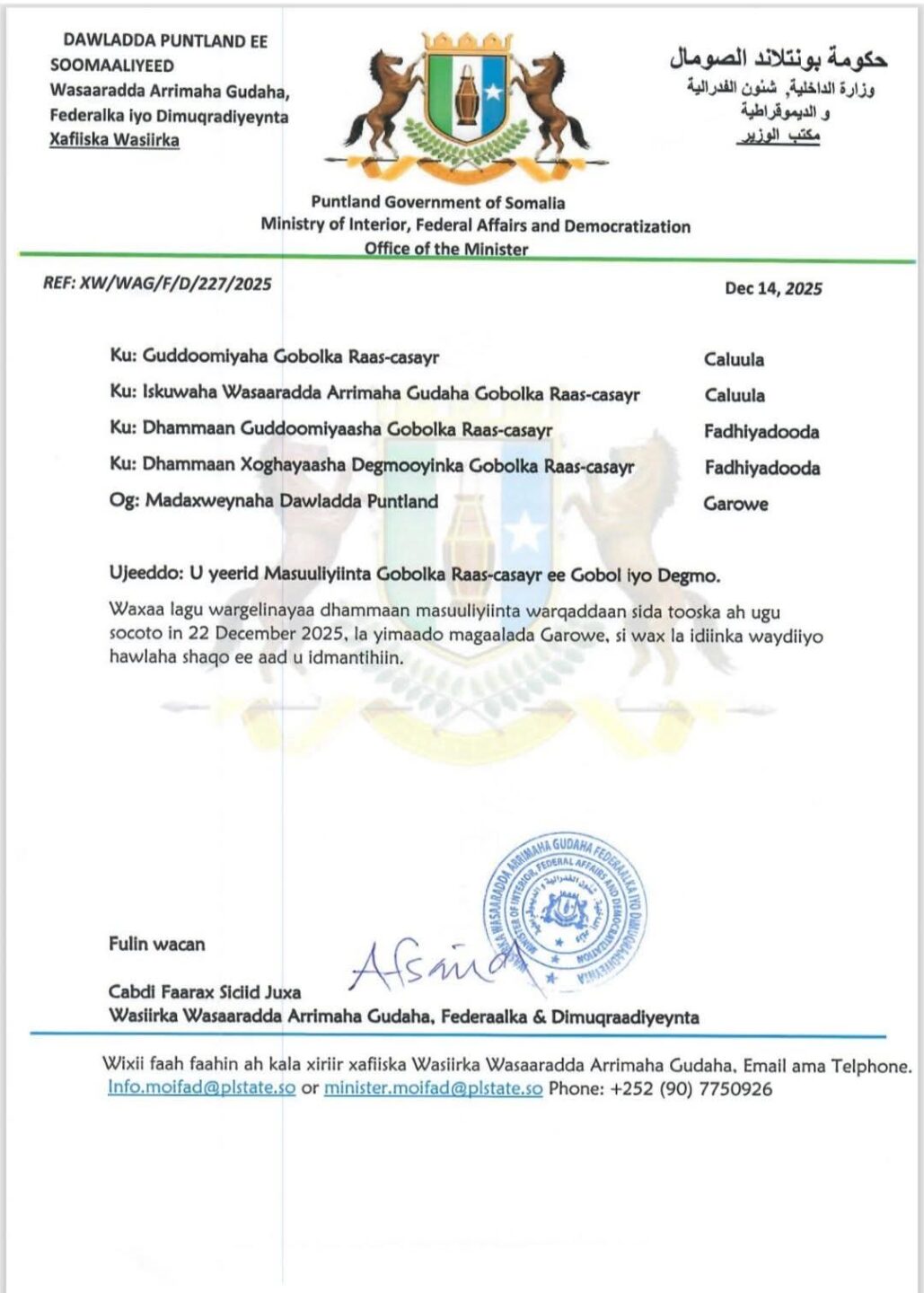Warqad ka soo baxay wasiir Juxa oo ku socotay guddoomiyaha gobolka Raascasayr, isuduwa wasaaradda ee gobolkaas, guddoomiyeyaasha degmooyinka iyo xoghayayaasha ayaa lagu wargeliyay in 25 bishan Diseembar ay yimaadaan magaaalda caasimadda ah ee Garowe.