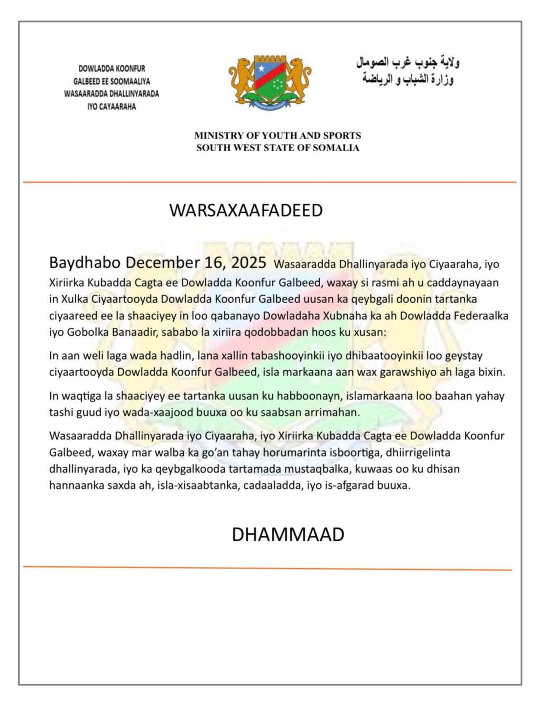 Dowlad goboleedka Koofur Galbeed ayaa si rasmi ah u shaacisay in uusan ka qaybgali doonin tartanka ciyaaraha kubbadda cagta ee dowlad goboleedyada iyo gobolka Banaadir oo la qorsheynayo in dhawaan lagu qabto Muqdisho.