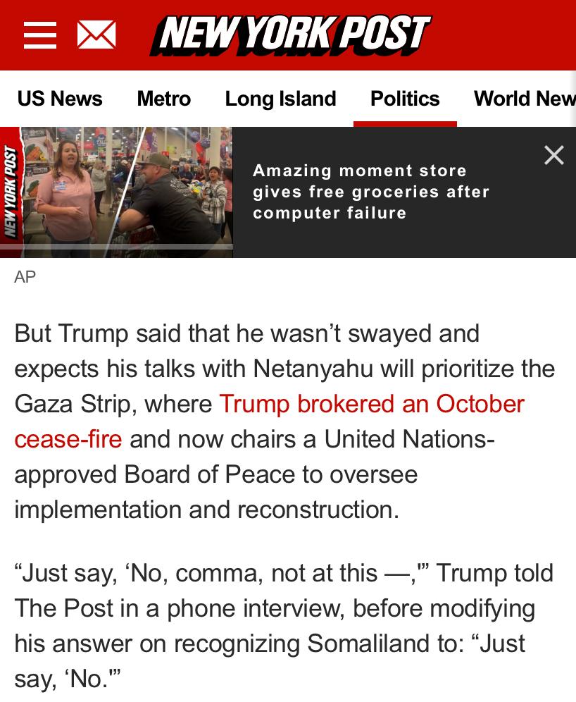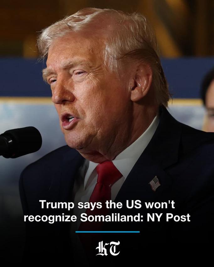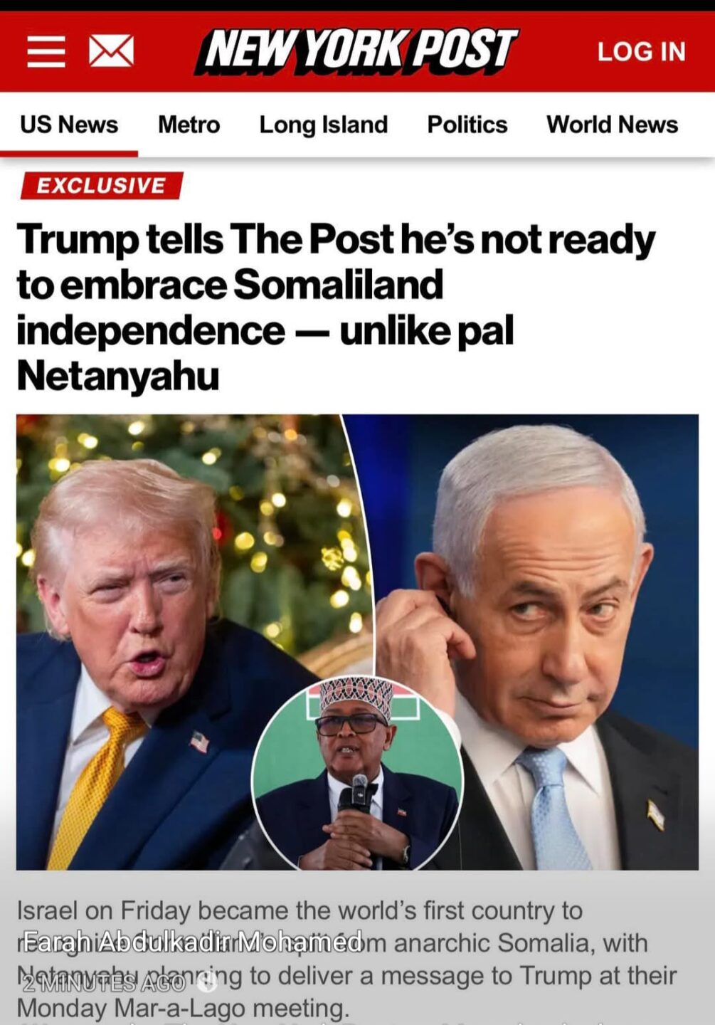 Madaxweyne Donald Trump ayaa si cad uga hor yimid aqoonsiga uu Benjamin Netanyahu ku tilmaamay inuu qeyb ka yahay heshiis lagu tilmaamo Abraham Accords. “Gaza ayaan mudnaanta siinayaa; ma aqoonsanayo Somaliland” ayuu u sheegay wargeyska New York Post.