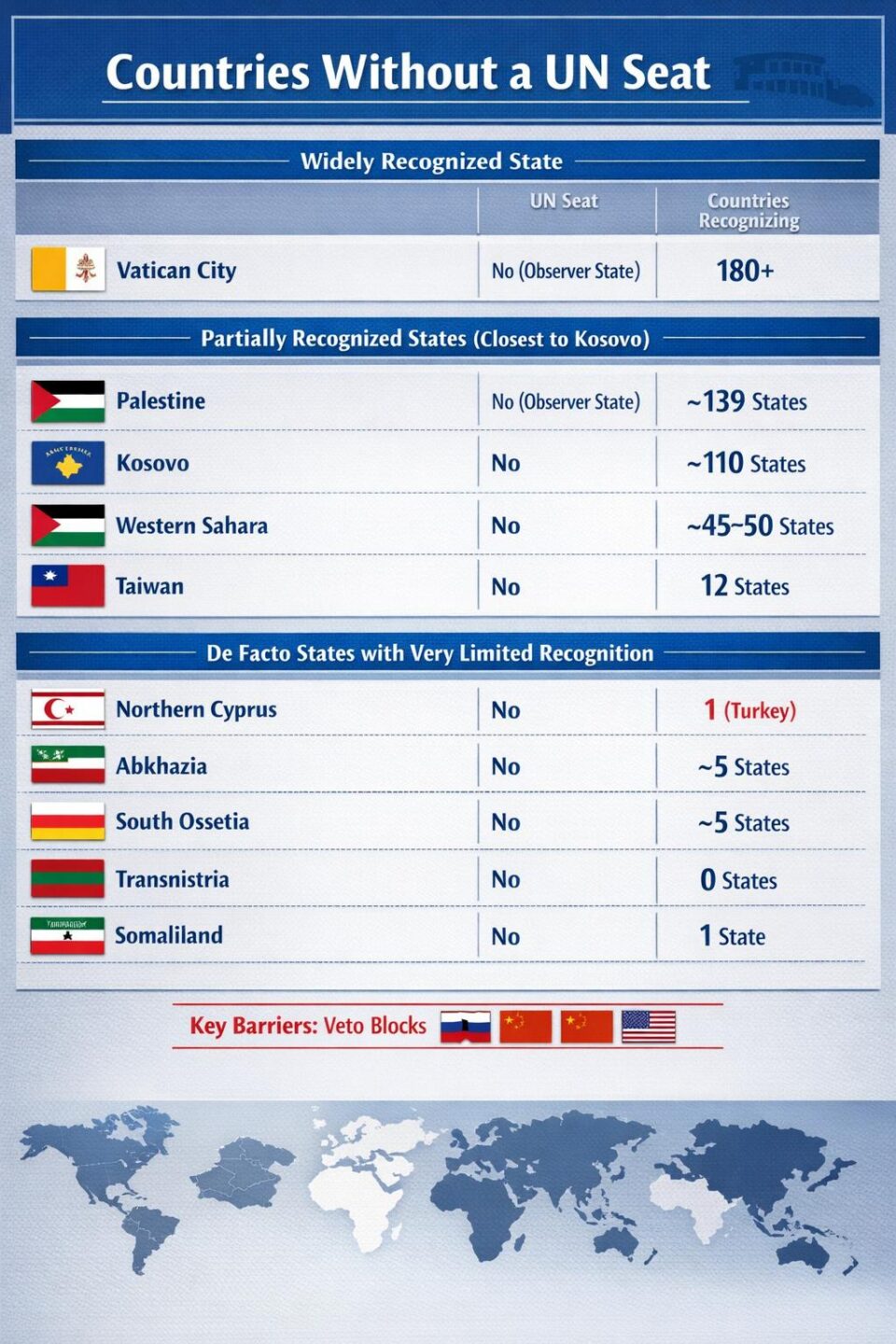 Aqoonsi la helo macnaheedu ma aha kursi lagu yeesho Qaramada Midoobay. Falastiin waxaa aqoonsaday in ka badan 130 dal; Kosoofo 110 dal baa aqoonsaday. Dalka Shiinaha ayaa ka hor yimid aqoonsiga ay Israa’iil siisay maamulka Somaliland oo xiriir dhow la leh Taiwan.