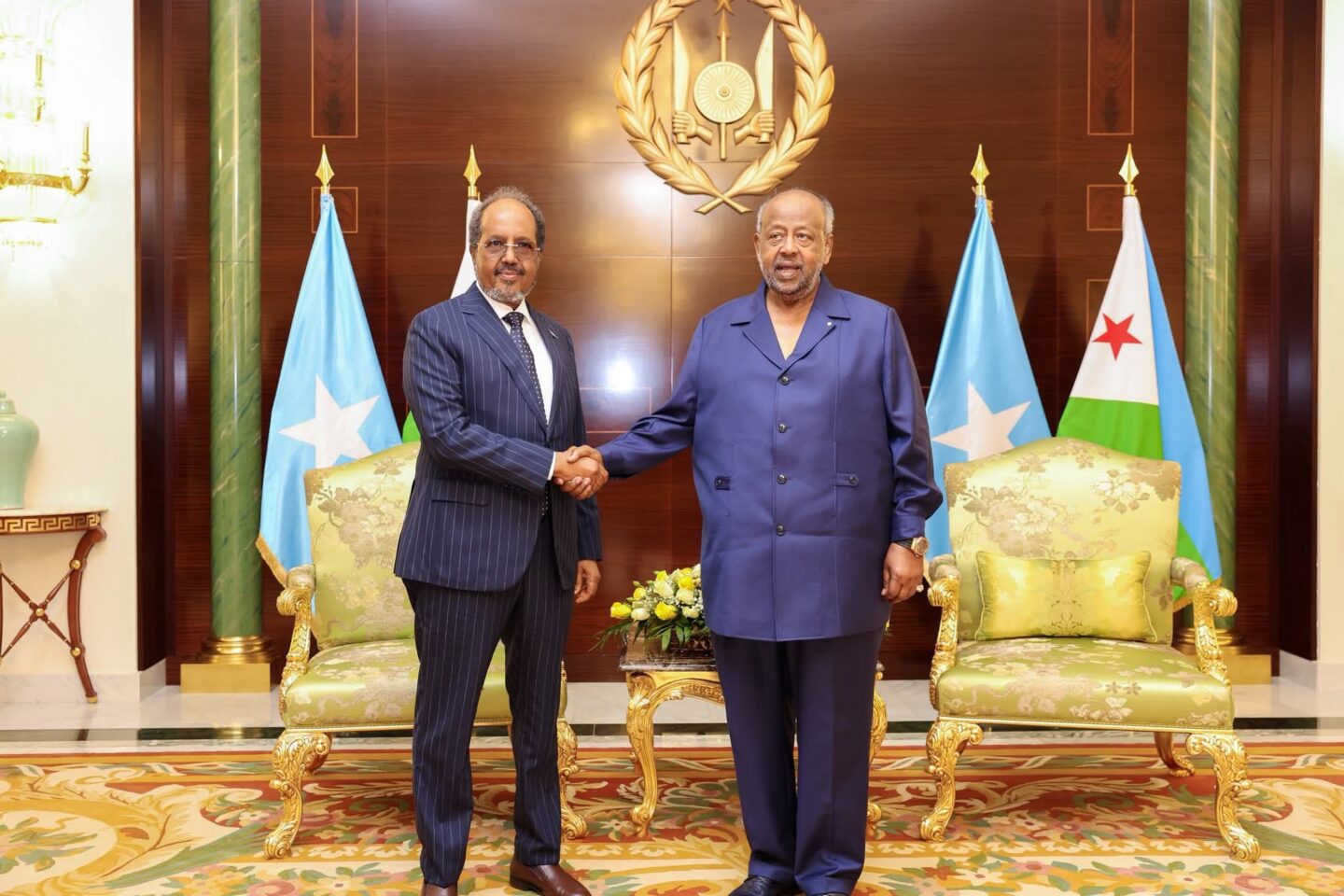 Madaxweynaha Dowladda Federaalka Soomaaliya Xasan Sheekh Maxamuud oo maanta gaaray magaalada Jabuuti ayaa la kulmay madaxweynaha dalka Jabuuti Ismaaciil Cumar Geelle.