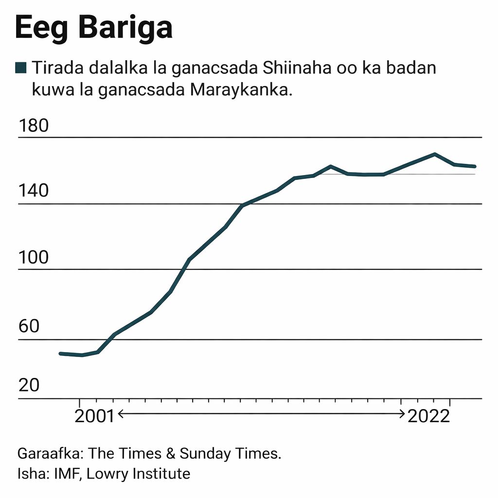 Wuxuu ku dooday in Shiinuhu yahay la-tartame ka awood badan Midowgii Soofiyeeti waayo wuxuu la falgalay dhaqaalaha adduunka. “70% dalalka adduunka ayaa la ganacsada Shiinaha waana tiro ka badan dalalka la ganacsada Maraykaka; sanadkii 2001 80% dalalka adduunka ayaa la ganacsan jiray Maraykanka oo waxay ahayd tiro ka badan tirada dalalka markaas la ganacsan jiray Shiinaha” ayuu Rishi qoray.