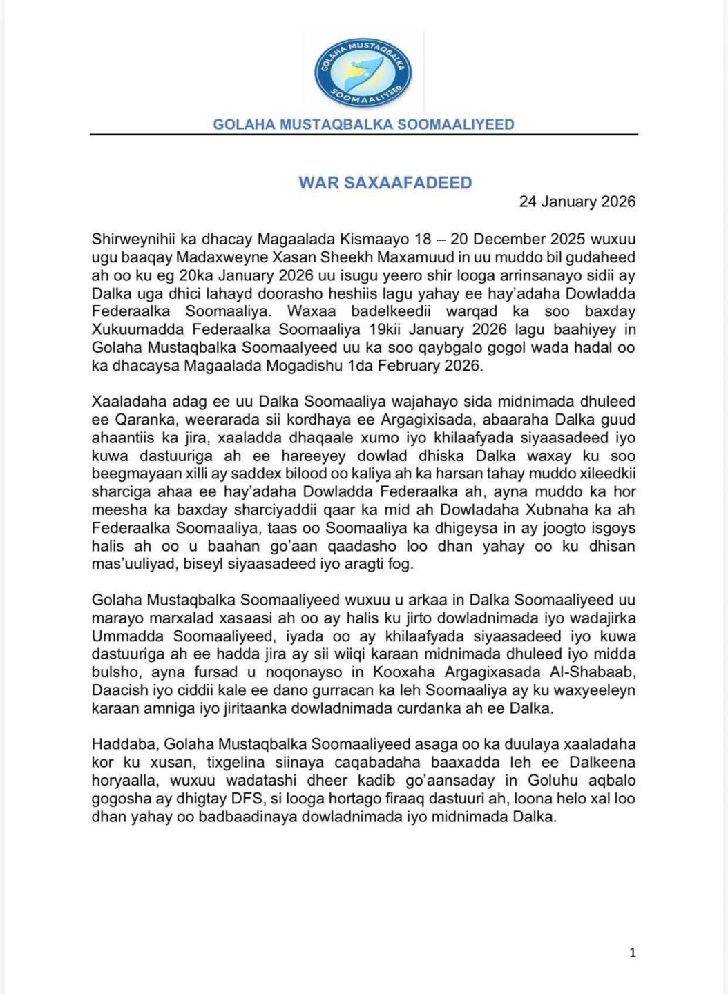 Golaha Mustaqbalka Soomaaliyeed ee ku mideysan yihiin Puntland, Jubaland iyo Madasha Samatabixinta ayaa war-saxaafadeed ay soo saareen ku abqalay gogoshii wadahadalka ee ay dhigtay Dowladda Federaalka Soomaaliya.