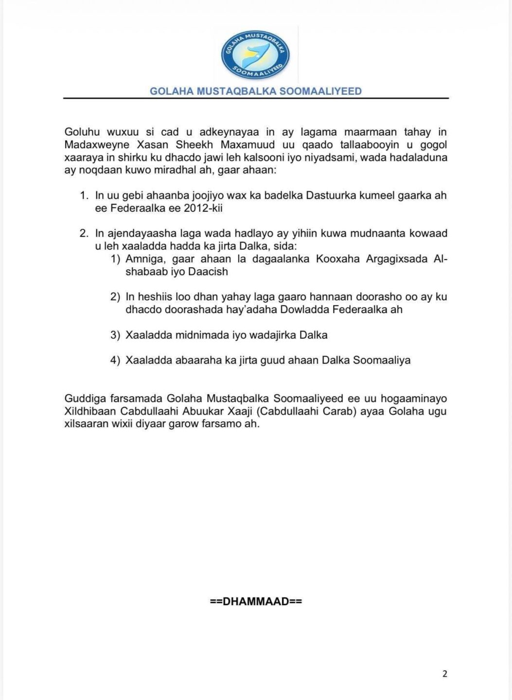Golaha Mustaqbalka Soomaaliyeed waxay madaxweyne Xasan Sheekh u soo jeediyeen in uu qaado tallaabooyin u gogol xaaraya in shirku ku dhacdo jawi leh kalsooni iyo niyadsami, wada hadaladuna ay noqdaan kuwo miradhal ah.