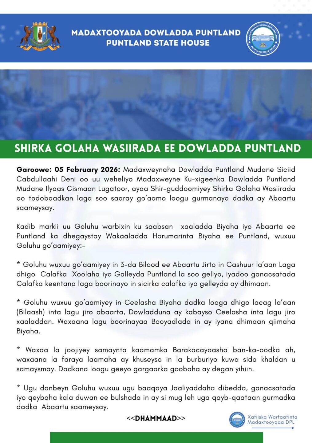Sidoo kale golaha wasiirrada Puntland ayaa go’aamiyay in ceelasha biyaha laga dhigo lacag la’aan, iyado oo dowladdu kabayso ceelasha, islamarkaana waxaa loogu baaqay booyadaha in ay dhimaan qiimaha biyaha.