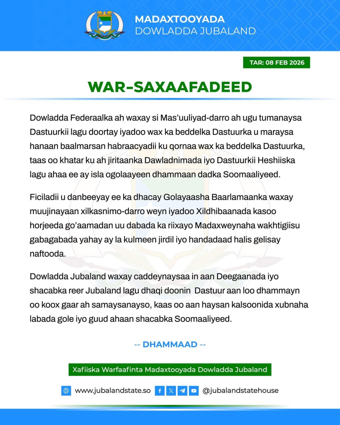 Hadal qoraal ah oo caawa ka soo baxay madaxtooyada Jubaland ayaa lagu yiri “Dowladda Federaalka ah waxay si mas’uuliyad darro ah ugu tumanaysaa dastuurkii lagu doortay, iyada oo wax ka baddelkiisa u maraysa hannaan baalmarsan habraacyadii ku qornaa wax ka baddelka dastuurka..”.