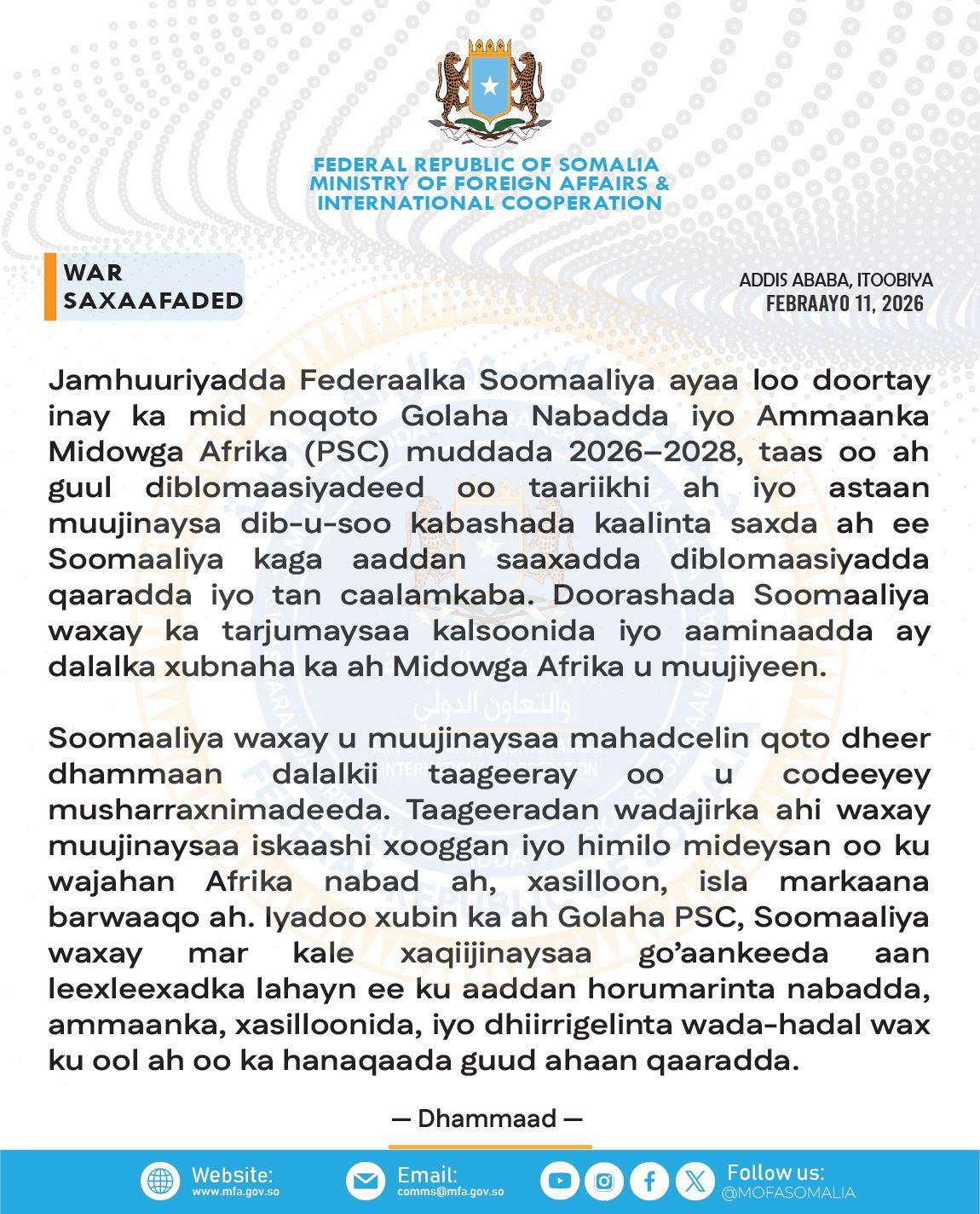 Soomaaliya ayaa loo doortay in ay xubin ka noqoto Golaha Nabadda iyo Ammaanka Midowga Afrika (PSC) muddada 2026–2028, kaddib doorasho ka dhacday magaalada Addis Ababa.
