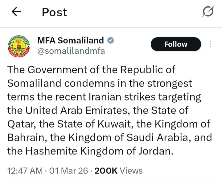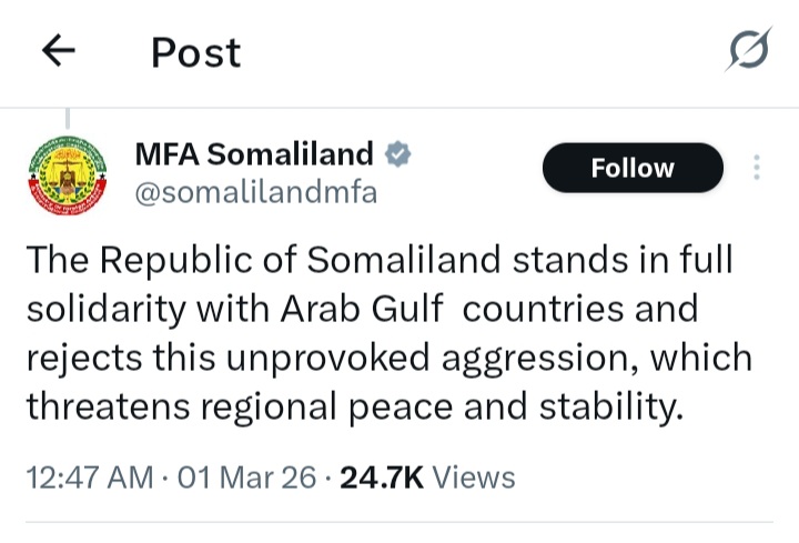 Bayaan ka soo baxay wasaaradda arrimaha dibadda Somaliland oo la soo dhigay barteeda X (hore loo oran jiray Twitter) ayaa lagu yiri “Xukuumadda Somaliland, waxa ay si adag u cambaaraynaysaa duqaymaha ay dawladda Iiraan ku bartilmaameedsatay Imaaraadka Carabta, Dawladda Qadar, Dawladda Kuwayd, Boqortooyada Baxrayn, Boqortooyada Sacuudiga iyo Boqortooyada Haashim ee Jordan”.