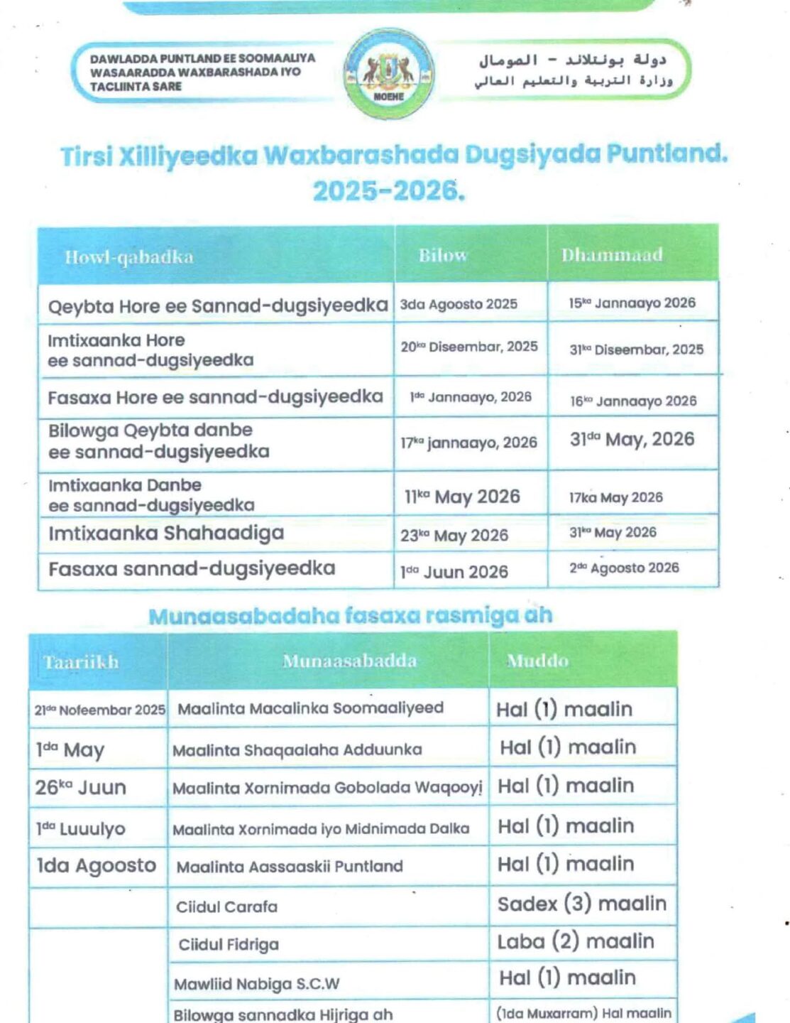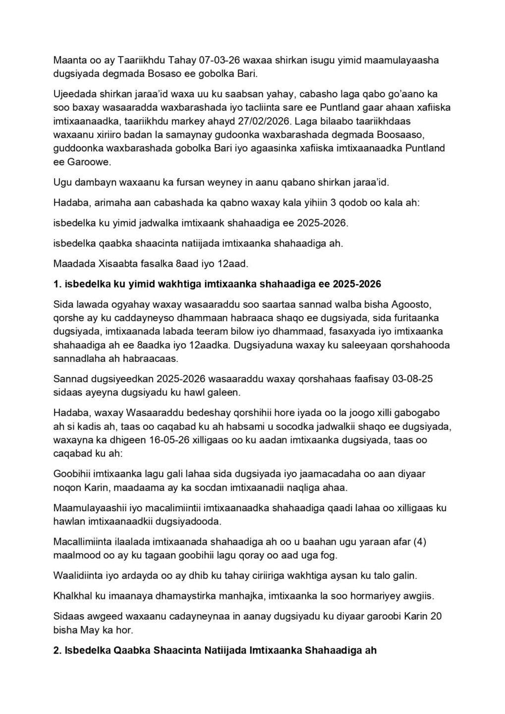 Waxay sheegeen in wasaaraddu jadwalka imtixaanka shahaadiga ah ee sanadkan ka dhigtay 16 bisha May, taas oo ku beegan xilli dugsiyada magaalada Boosaaso ku jiraan imtixaanada kale.