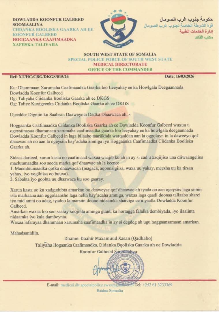 Sidoo kale maamulka Koonfur Galbeed waxa uu maanta ku amray xarumaha caafimaadka magaalada Baydhabo in aysan daaweyn karin qof aysan soo ogaysiin hay’adda amniga.