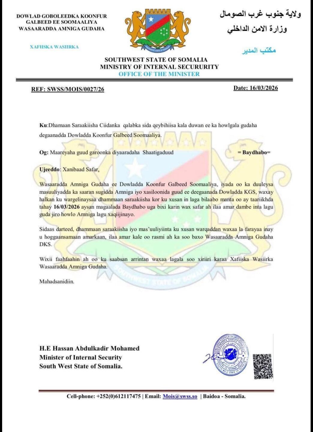 Go’aankan ayaa dhigaya in aan wax safar ah laga bixi karin magaalada Baydhabo ilaa amar dambe, sida lagu sheegay qoraal ka soo baxay wasaaradda amniga maamulka Koonfur Galbeed.
