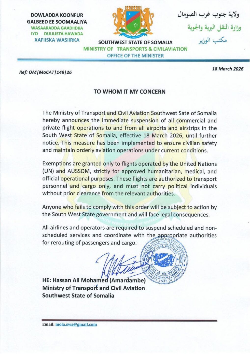 Qoraal ka soo baxay wasaaradda gaadiidka iyo duulista hawada Koonfur Galbeed ayaa lagu sheegay in go’aankan uu yahay mid lagama maarmaan u ah xaqiijinta amniga iyo ilaalinta kala dambeynta.