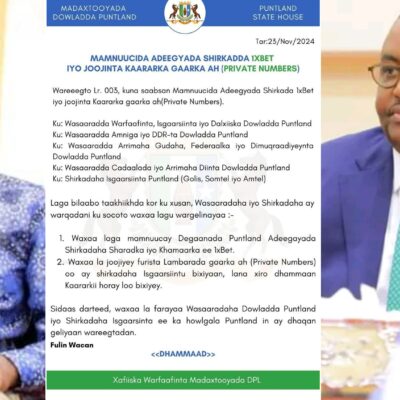 Garowe (PP News Desk) — The Puntland State of Somalia Presidency yesterday issued an executive decree banning the 1XBET app,… Sii akhri