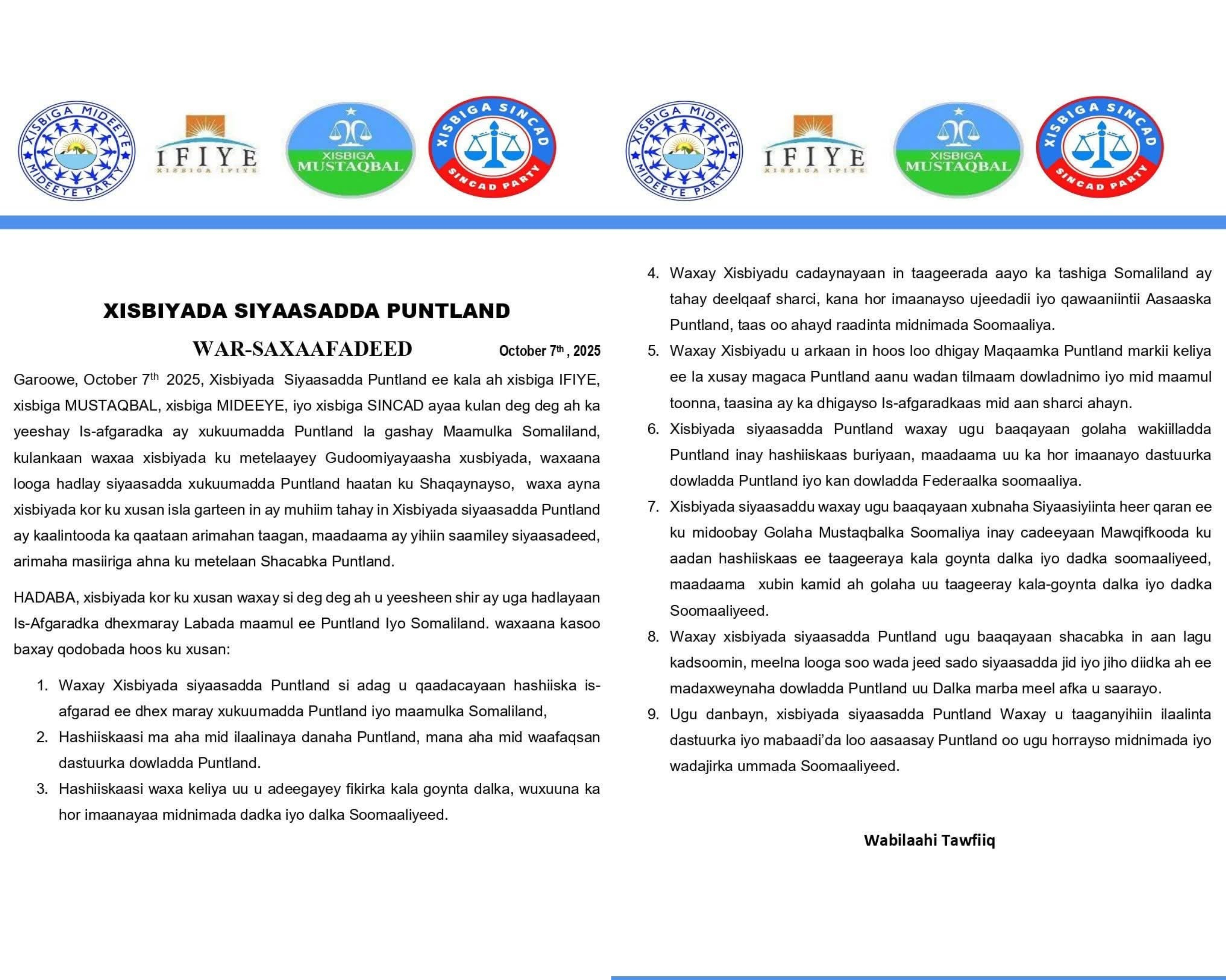 Garowe (PP News Desk) — Four political parties of Puntland State of Somalia have rejected the security Memorandum of Understanding… Sii akhri